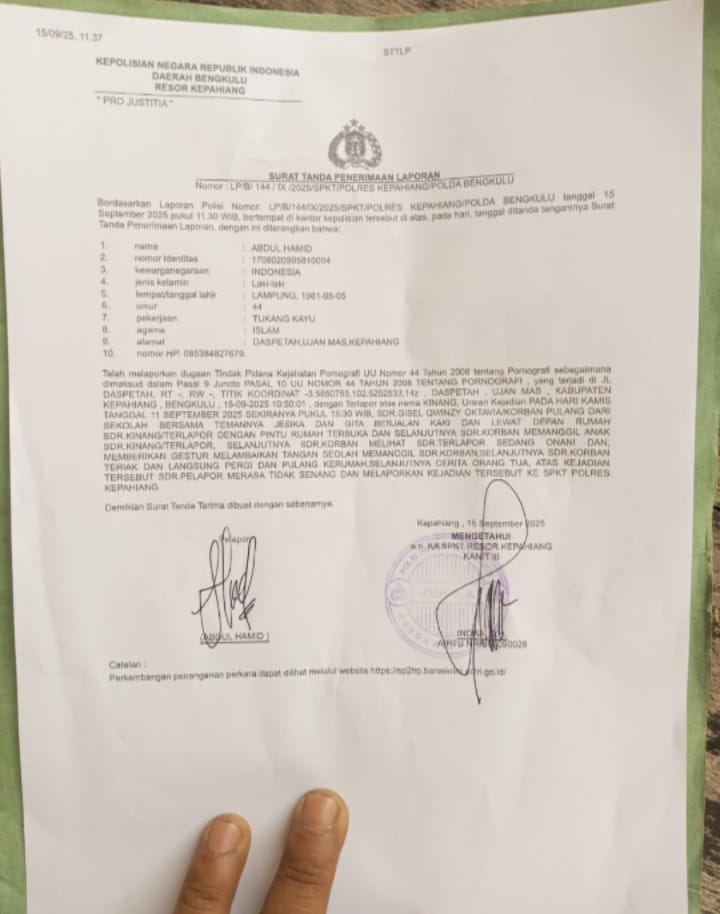 Bengkulu kab Kepahiang – 21/9/25,lagi lagi desa daspeta kecamatan ujan mas,kabupaten Kepahiang,provinsi Bengkulu di hebohkan dengan kejadian asusila yang diduga di lakukan oleh seorang oknum pria telah berumur inisial (KN) yang mana telah melakukan onani .