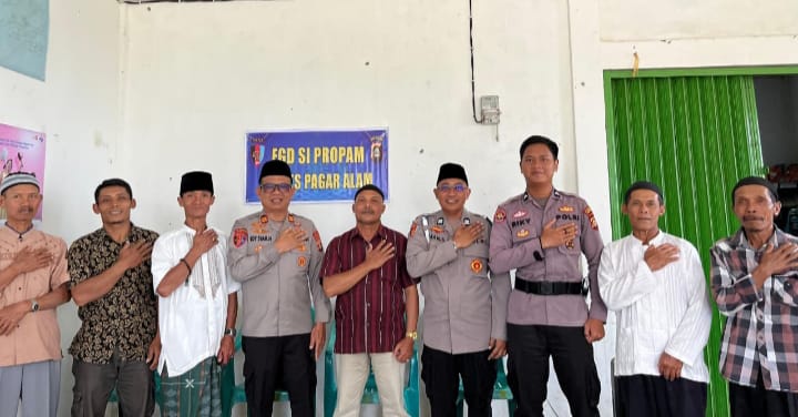 Publikasi Nusantara com,-Pagaralam Senin, 22 September 2025, Polres Pagaralam melalui Unit Propam menggelar Forum Group Discussion (FGD) yang dipimpin oleh Kasi Propam AKP Edy Syamputra bersama Kanit Provost Aiptu Iman Setiawan, SE. Kegiatan ini dihadiri oleh ketua RW, RT, tokoh agama, serta tokoh masyarakat sebagai bentuk silaturahmi dan komunikasi bersama.