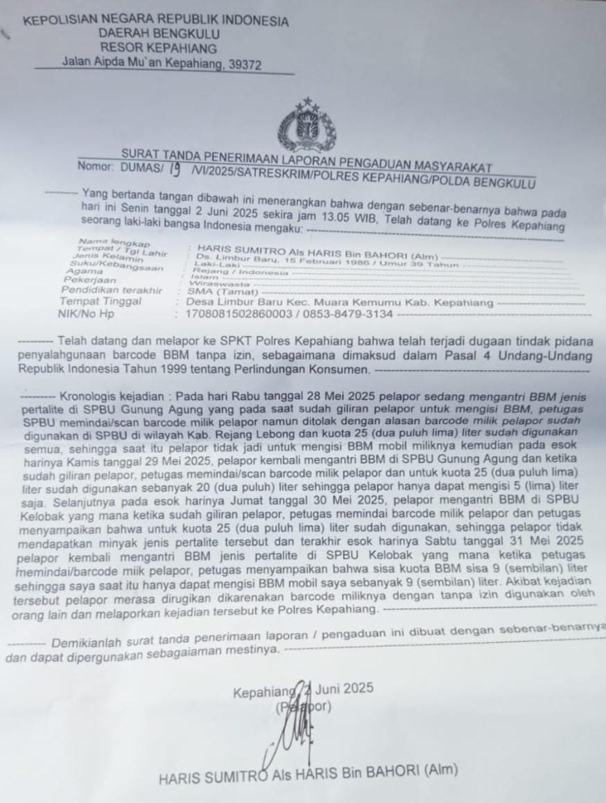 Bengkulu Kabupaten Kepahiang ketua umum Organisasi kemasyarakatan OMBB M.Diamin,Senin 2 Juni 2026 mendampingi masyarakat yang bernama Haris Sumitero/Haris Melapor kan ada nya dugaan Penyalahgunaan Barcode BBM tanpa seizin pemilik di polres Kabupaten Kepahiang,.bagai mana di maksud dalam pasal 4 Undang-undang Republik Indonesia Tendang perlindungan konsumen.2/5/2025