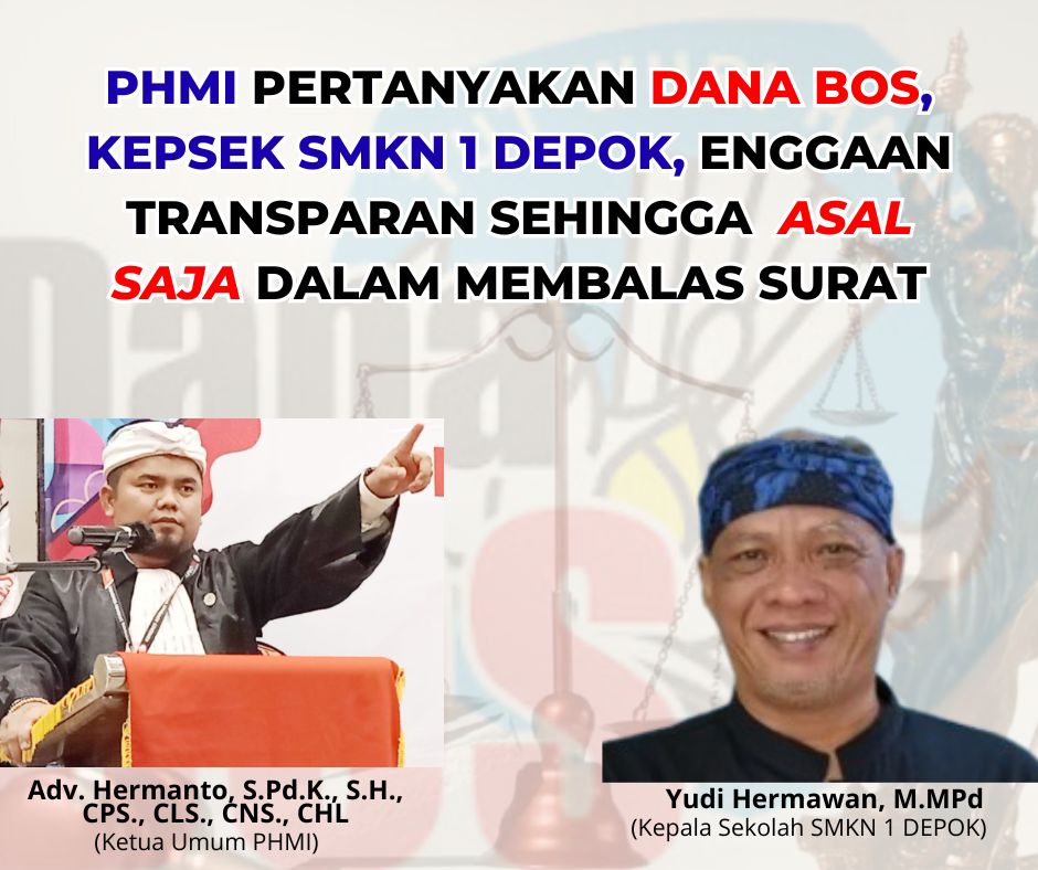 PHMI | Kota Depok – Perisai Hukum Masyarakat Indonesia (PHMI) mempertanyakan anggaran transparansi alokasi dan Penggunaan Dana BOS pada SMKN 1 Depok pada tiga (3) tahun terahir. Hal itu disampaikan langsung oleh Adv. Hermanto, S.Pd.K., S.H., CPS., CLS., CNS., CHL selaku ketua umum PHMI pada awak media 04/3/26.