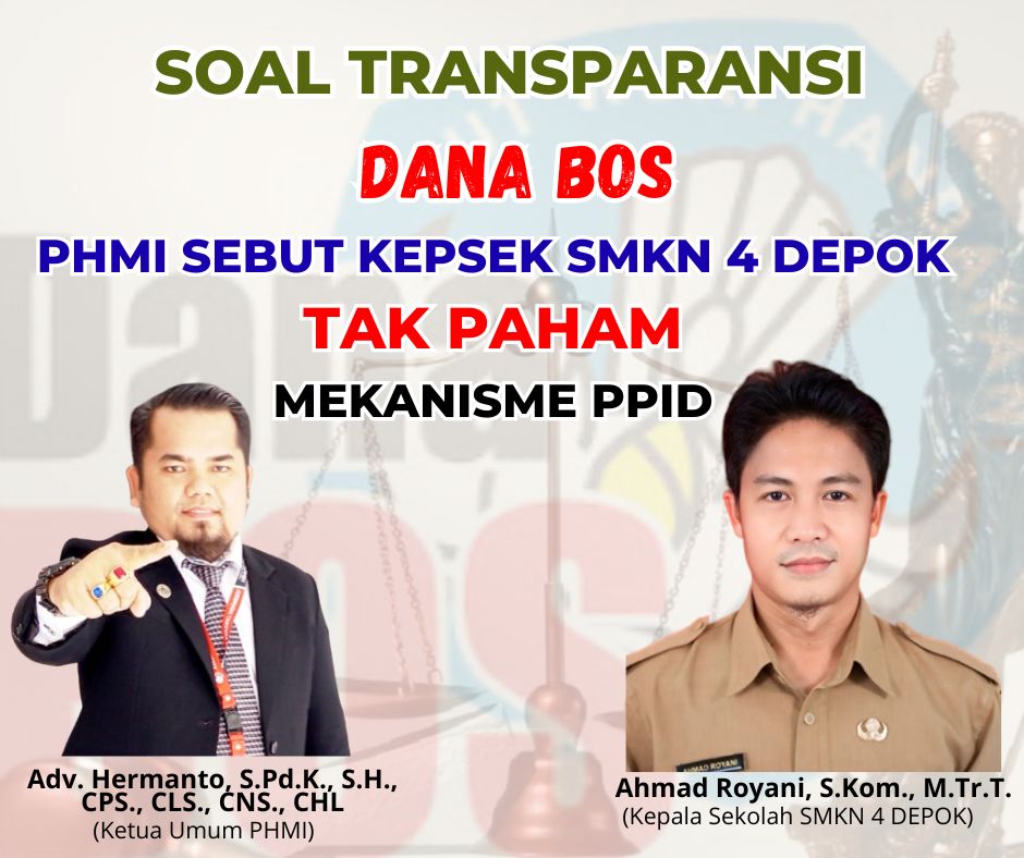PHMI | Kota Depok – Perisai Hukum Masyarakat Indonesia (PHMI) mempertanyakan anggaran transparansi alokasi dan Penggunaan Dana BOS pada SMKN 4 Depok 3 tahun terahir. Hal itu disampaikan langsung oleh Adv. Hermanto, S.Pd.K., S.H., CPS., CLS., CNS., CHL selaku ketua umum PHMI pada awak media 02/3/26.