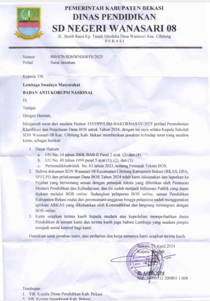 Dan Pada tanggal 24 Januari 2025, BAKORNAS menerima surat balasan atau jawaban dari SDN Wanasari 08, dan SDN Wanasari 08 menjawab dengan nomor Surat 800/076/SDNWNS08/IV/2025 dengan jawaban sudah melaporkan kepada pejabat yang bewewenang. Dan tidak menjawab sesuai dengan apa yang di pertanyakan BAKORNAS. Dan semua yang di pertanyakan oleh BAKORNAS dalam surat klarifikasi nya tidak ada yang dijawab oleh SDN Wanasari 08, pungkasnya