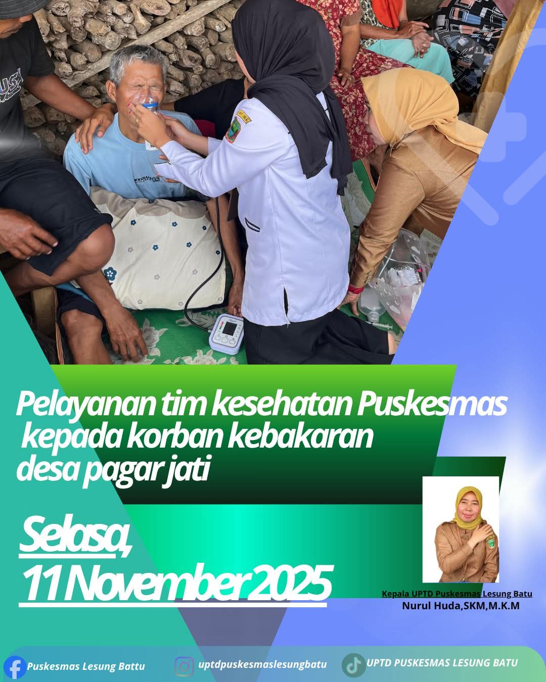 Nurul Huda.,S.KM.,M.KM. menjelaskan”Untuk memastikan kondisi kesehatan para korban dan warga yang berada di sekitar lokasi kejadian, tim kesehatan segera diterjunkan guna memberikan layanan medis darurat. Kami Tim medis dari UPTD. Puskesmas Lesung Batu mempersiapkan pos siaga, melakukan pemeriksaan kesehatan, serta memberikan pertolongan kepada warga yang mengalami gangguan pernapasan ringan akibat paparan asap maupun keluhan lain.